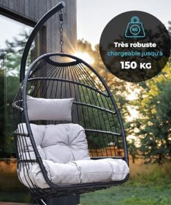 Avec une capacité de charge impressionnante de 150 kg, ce fauteuil suspendu allie robustesse et stabilité. Son cadre en acier, associé à une base antidérapante, procure une assise sécurisée. Le mousqueton facilite également l’utilisation, permettant de détacher aisément le panier du cadre pour un déplacement simple et rapide.